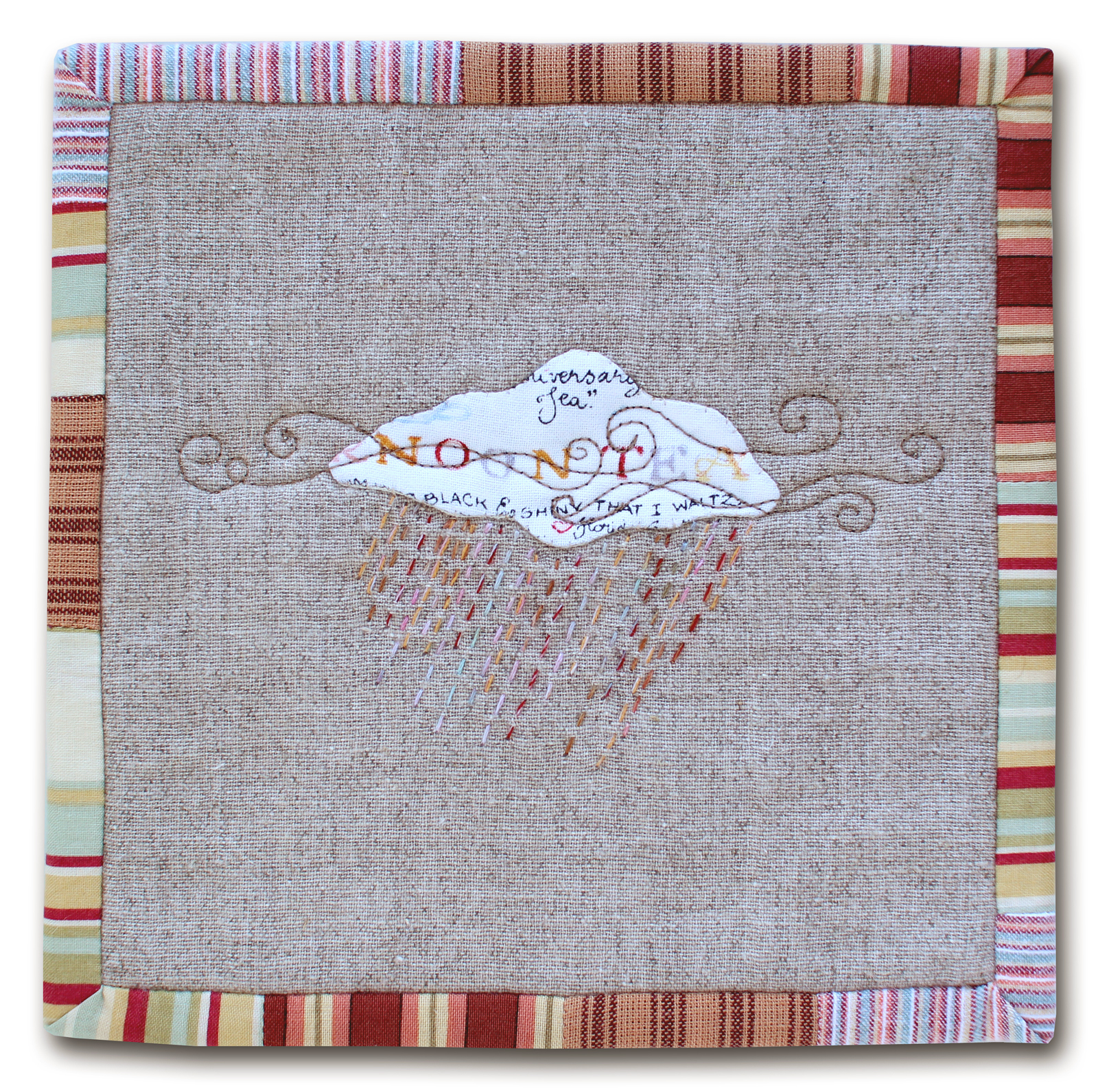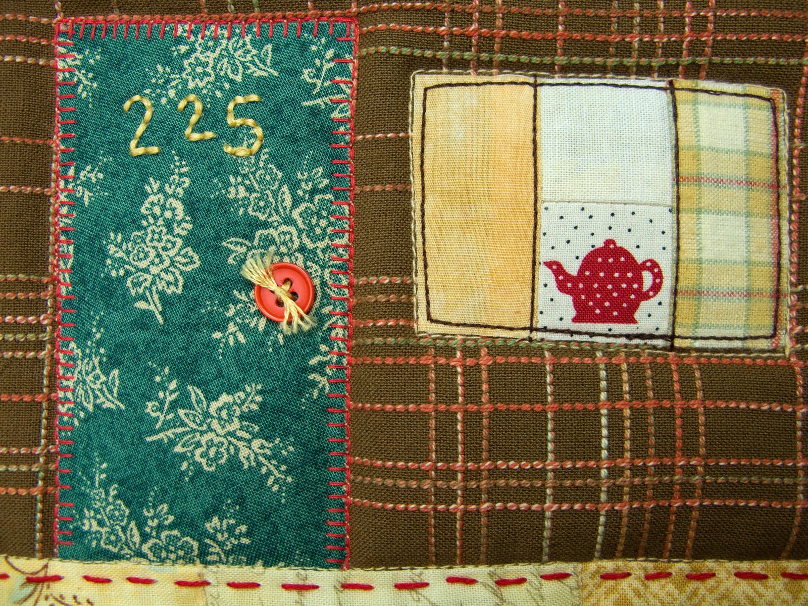 I noticed than I have been adding a lot more embroidery to my creations now and I am enjoying the hand-sewing immensely! I believe my method of embroidery is different than the regular hoop method. I make the quilt first and add the embroidery as the last step. Working from the top of the quilt, I sew through the top fabric and some batting and I avoid piercing the backing fabric. It works for me!