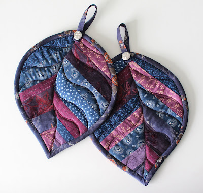 Here are some more leaf potholders that I made for a friend's housewarming present a few months back. She loves purples and blues and celestial as you can probably tell by looking at them because they are not my usual colours to work with. I pieced together the fabrics in straight lines but curve-pieced the centre vein of each leaf. I like them even more than these crazy patch leaves.